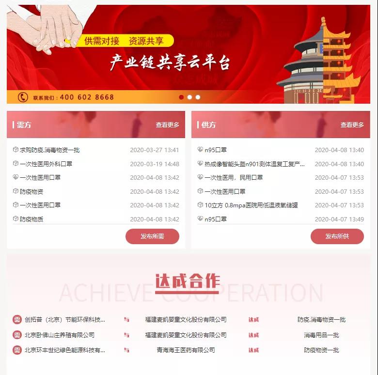 3月16日,市政府辦公廳印發(fā)《關(guān)于全力做好疫情防控工作保障企業(yè)有序復(fù)工復(fù)產(chǎn)的若干措施》,其中第四條明確提出:“在北京產(chǎn)權(quán)交易所搭建復(fù)工復(fù)產(chǎn)產(chǎn)業(yè)鏈需求對(duì)接平臺(tái)并開(kāi)通手機(jī)客戶端,服務(wù)企業(yè)發(fā)布原材料、零部件、設(shè)備等供需信息”。自此,作為共享經(jīng)濟(jì)、信息經(jīng)濟(jì)、數(shù)字經(jīng)濟(jì)的云平臺(tái),該平臺(tái)已成為北京乃至全國(guó)防護(hù)新冠肺炎疫情及促進(jìn)產(chǎn)業(yè)鏈資源高效共享的重要基礎(chǔ)設(shè)施,在助力疫情防控和復(fù)工復(fù)產(chǎn)方面發(fā)揮了重要作用。
