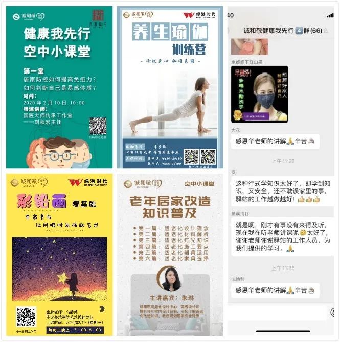 誠和敬組織制作了“翹首未來,共迎花開”空中詩會活動?;顒佑绅B(yǎng)老一線工作者、老人、朗誦愛好者等用視頻錄制的方式朗誦詩歌,用詩歌頌揚(yáng)真善美,提振精氣神,匯聚正能量,為堅決打贏疫情防控阻擊戰(zhàn)加油鼓勁,目前已上線更新6期精彩節(jié)目。同步推出系列銀發(fā)精品課程,將以往深受老人喜愛的課程轉(zhuǎn)移到線上,邀請多位老師開設(shè)空中課堂,讓老人在疫情期間通過豐富的課程學(xué)習(xí)技能,居家隔離也能豐富多彩。目前針對老人的需求已開設(shè)“健康我先行”、“零基礎(chǔ)鉛彩畫和線描畫”、“養(yǎng)生瑜伽訓(xùn)練營”、“隸書親子在線課”、“素質(zhì)英語”“適老化改造”等6類課程。自2月中旬以來,累計開課39次,服務(wù)老人12000余人次。