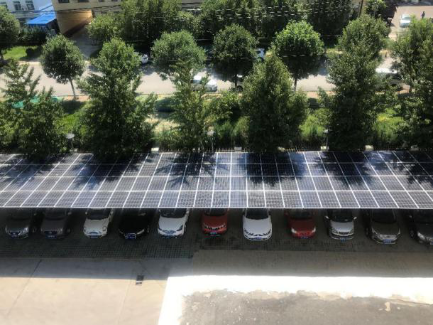 九朗新能源公司通過(guò)再擔(dān)保公司“節(jié)能貸”產(chǎn)品獲取授信后,為高耗能企業(yè)建設(shè)的采用“自發(fā)自用、余量上網(wǎng)”模式的車(chē)棚分布式電站。