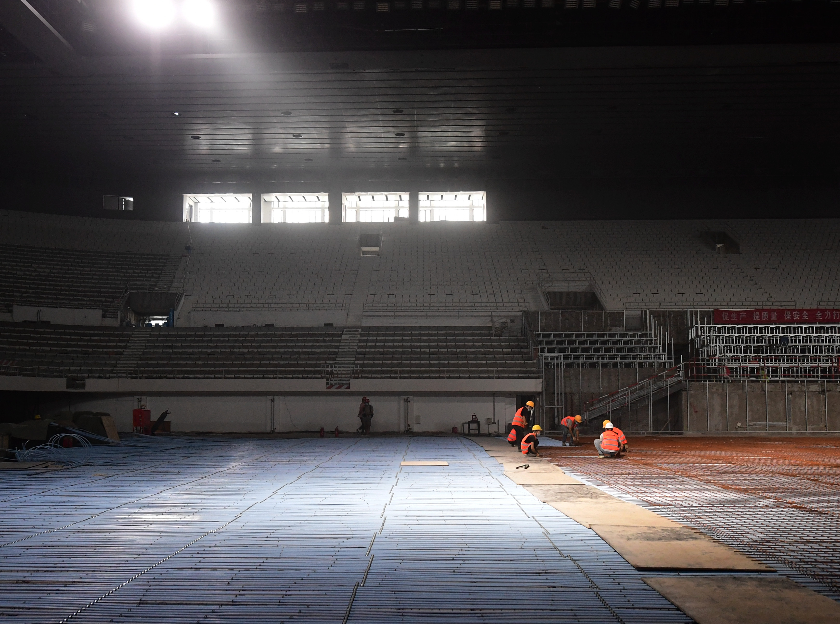 工人在首都體育館內(nèi)施工。新華社記者張晨霖?cái)z